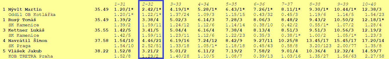 Postup na dvojku už ale tak slavný nebyl, ačkoli s 11 časem, dostali více jak půl minuty, když se cestou zastavili na osmnáctce. Zde se ukazuje síla jejich největšího soupeře. Martin Nývlt suverénně vyhrává první dva mezičasy a získává tak výrazný náskok. Koncentraci se ale klukům daří dostat do požadovaných hodnot a až na drobnou chybku na 5 kontrolu, která byla způsobena nečekaným plotem v mapě, běží rychle a přesně. Je pravda, že občas jim přeje i štěstí, protože třeba taková dvanáctka byla hodně na náhodu, ale to přeci přeje připraveným.